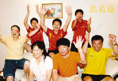 ■17日在遼寧撫順王楠的家中,王楠的父母(前右二、右三)和隊友教練一起歡慶。 新華社