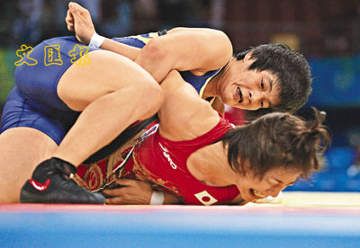 ■17日,在北京奧運會摔跤女子自由式72公斤級比賽中,王嬌(藍)先後戰勝日本選手及保加利亞名將,成為新一代「霸王花」。 新華社