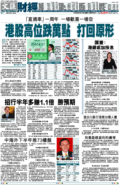 今日為「港股直通車」宣布一周年,港股已打回原形。去年自8月17日起,美國次按危機正式爆發,港股隨外圍劇烈波動,波幅動輒逾千點,大市並曾跌穿20,000點,20日內地宣布推出「港股直通車」,令當日恆指從低位反彈1,208點以21,595點報收,其後展開了港股這次熊市前的最後升浪,最高升至32,000點歷史高位。事隔一年,「直通車」期望已消退,恆指亦返回一年前的水平,昨日收報20,484點,高位回落逾萬點。
