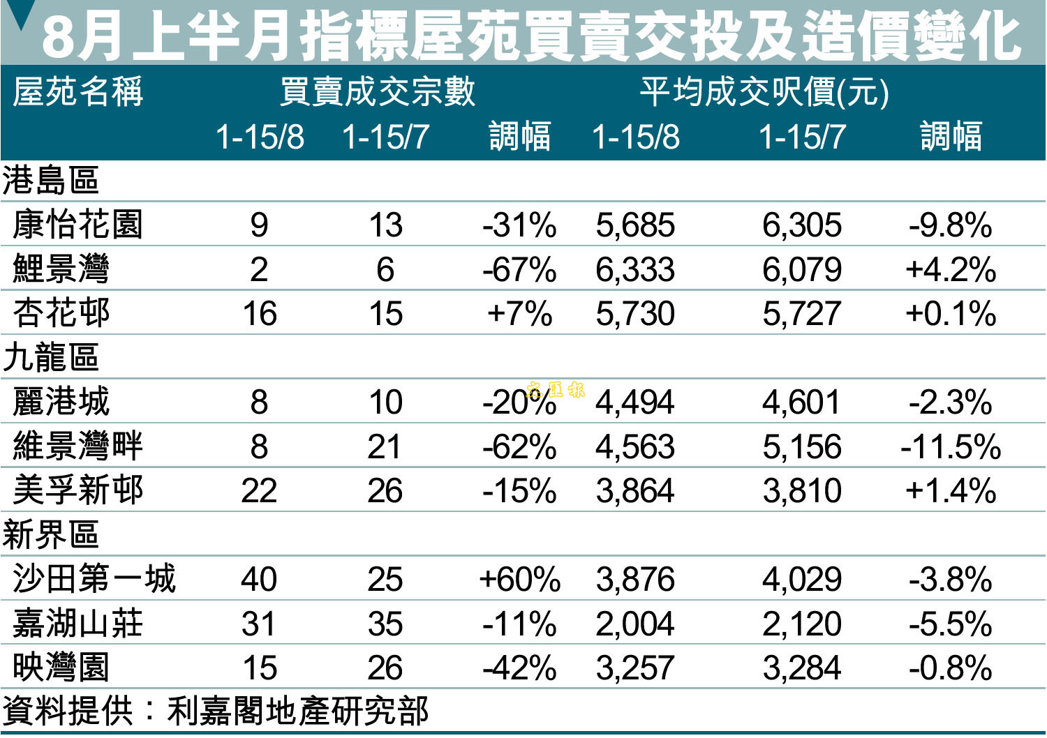 8月上半月指標屋苑買賣交投及造價變化 (圖)