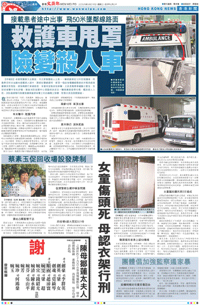 【本報訊】老爺救護車又出事故,今次更險變殺人工具。一輛車齡將近10年的救護車,昨晨奉召前往油麻地接載病人途中,駛經紅磡繞道時,車頂一個由玻璃纖維製造的冷氣系統保護罩突告飛脫,跌落隔鄰行車線路面,幸當時並無其他車輛,尤其是電單車鐵騎士駛至,否則若被擊中非死即傷。事後消防指揮中心須臨時改派另一輛救護車接替任務,載送病人入院,消防處將聯同負責救護車維修保養工作的機電工程署,對意外原因展開調查。