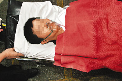 一名毒品拆家昨晨在新蒲崗遇上便衣巡邏警員,疑作賊心虛掉頭逃走,並狂吞14粒懷疑海洛英毒品企圖毀滅證據,被捕後疑腹中毒品藥力發作,神志不清,需2名警員押送醫院洗胃。圖為吞毒品不適男子送院。本報記者蔣焯文 攝