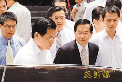 ■陳水扁等遭前海軍軍官雷學明控告誹謗案,19日現身台北地方法院。經長達兩個半小時的證據調查及言詞辯論後,陳水扁(中)不發一語離開法院。 中央社