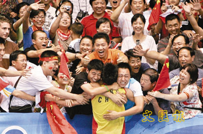 ■17日,林丹戰勝對手後,激動地衝向觀眾席,與觀眾擁抱。美聯社
