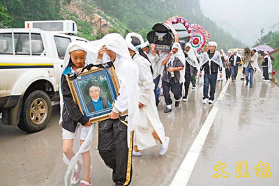 ■萬計北川民眾徒步返回北川災區,祭奠百日前地震死去的親人。本報北川傳真