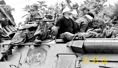 ■俄軍在黑海重要石油港口波季扣押約20名格國戰俘,並將他們幪眼。 美聯社
