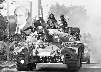 ■俄軍坦克駛過南奧塞梯時,當地懸掛普京巨型海報。美聯社