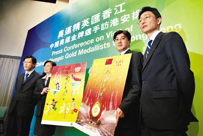 ■國家奧運金牌運動員下星期五將來港訪問三日,進行多場示範和大匯演。圖為港協暨奧委會義務副秘書長梁美莉及康文署署長周達明公布售票詳情。 本報記者莫雪芝 攝