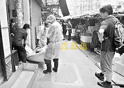 ■在土瓜灣炮杖街睇樓變睇屍的青年屍體,事後由仵工送往殮房,右為死者親友。