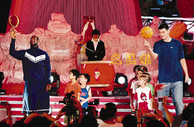 ■21日,中美兩大籃球巨星──姚明和「大帝」勒邦.詹士,亮相北京世貿天階奧運文化廣場,為台下球迷獻技。中新社
