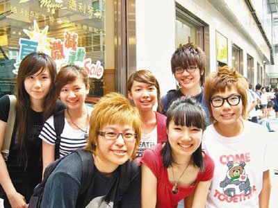 ■於金馬倫道的通利琴行排頭位的7位應屆會考生,當中黃小姐(前左一)表示,前晚11時左右與6位友人一同排隊。