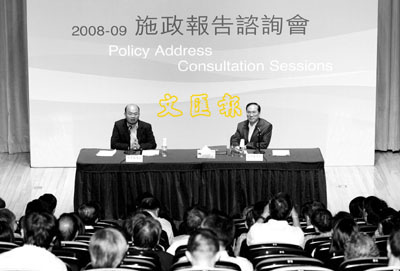 ■曾蔭權昨日出席首場施政報告地區諮詢會,聽取九龍地區人士的意見。他透露,施政報告將以民生經濟為主調,新年度會有更多照顧低收入人士的措施。 本報記者劉國權 攝