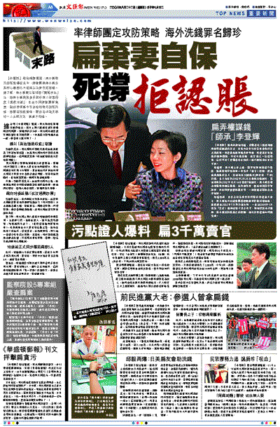 【本報訊】綜合媒體報道:陳水扁海外密賬案爆發至今,律師團與陳水扁及其核心幕僚已大致確立法律攻防策略。據了解,陳水扁辦公室採取「斷尾求生」法,將陳水扁與其妻吳淑珍兩人涉案程度「徹底切割」,且由不同律師團隊負責,堅持表明扁今年初始知海外密賬內情,選舉結餘款管理、匯出等均為吳淑珍一人主導決定,扁毫不知情。