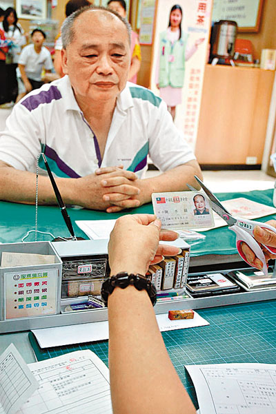 曾改名為「陳水扁」的台北縣永和市民陳柏仁,21日前往永和戶政事務所辦理更名,將名字改回陳柏仁,戶政人員拿剪刀剪掉作廢的「陳水扁」身份證。中央社
