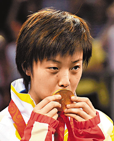 ■張怡寧獲得金牌後,「小心翼翼」地親吻。 路透社
