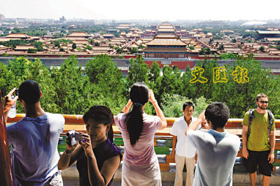 ■北京新建很多現代場館,遊客們拍照的故宮午門的背景中,隱約可見國家大劇院「巨蛋」,與古建築相映成趣。