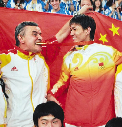 ■仲滿奪得男子佩劍冠軍,法國籍教練克里斯蒂安·鮑埃爾激動得咬住仲滿的金牌。新華社