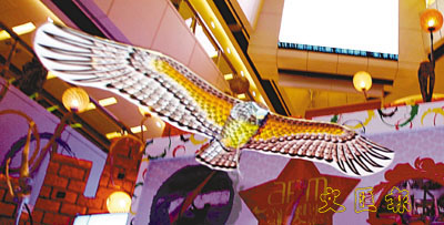 有天,外邊還下著濛濛細雨,當記者走進商場內,突然「口彭」的一聲,感到有甚麼在頭上飛過,抬頭看,竟然是隻大鷹,再看真些,原來是風箏。記得小時候,放風箏必定要在郊外有風才可放,原來現在有位「鷹王」發明了絕招「無風放飛」,亦即無風放風箏。這位「鷹王」就是來自北京的風箏紮製大師王赤峰。他精於紮製鷹的風箏,更練成了放風箏絕技。