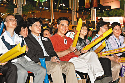 ■康文署署長周達明(左二)、行政會議召集人梁振英(左三)及民政事務總署署長陳甘美華(右三)等在沙田公園的奧運文化廣場觀看奧運閉幕禮。 本報記者劉國權 攝