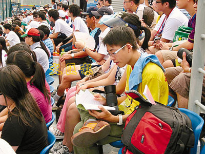 ■方志信在曲棍球比賽休場期間,溫習隨身攜帶的會考試題。