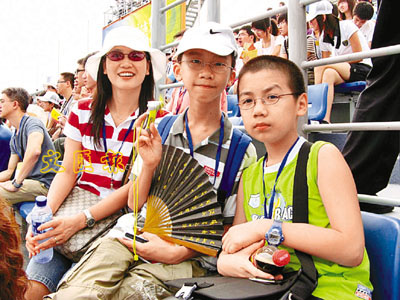 ■胡誠軒、陳惠翔與觀眾一起為中國隊打氣。旁為老師陳柳芬。