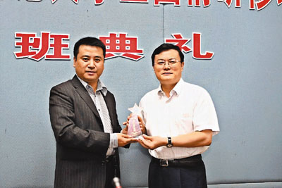 ■國情班團長、本報澳門辦副主任王海濤(左)贈送紀念品予南京大學副校長張榮。
