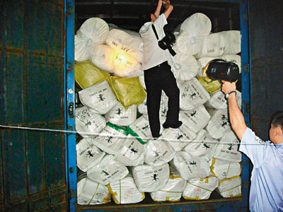 去年5月13日,深圳海關緝私局所屬的沙灣分局接到舉報,指有幾輛粵港兩地牌貨車走私牛皮、布料等貨物,並將走私貨物存放在文錦渡某倉庫。沙灣分局立即組織人員對嫌疑車輛進行調查監控。經查閱相關資料,緝私警察發現,有兩輛嫌疑貨車頻繁以不同貿易方式申報貨物進出口。