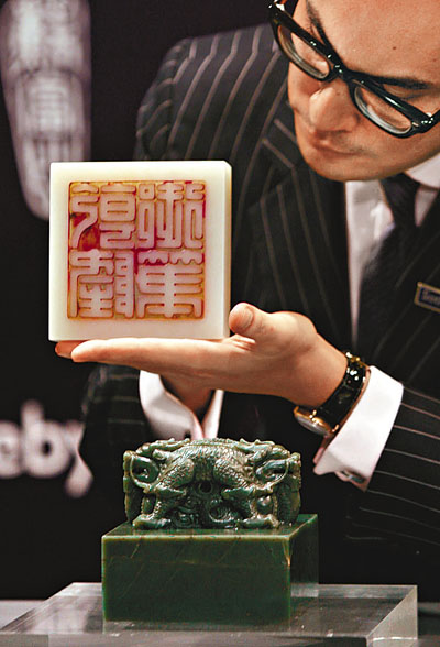 ■皇威萬代專場拍賣會中 ,最受矚目的是「乾隆御筆」寶璽。本報記者莫雪芝 攝