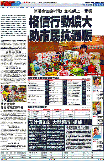 【本報訊】(記者 郝君兒)本港通脹持續升溫,多數市民的薪金增長相對緩慢,生活百上加斤。為助市民對抗通脹,消委會昨日宣佈擴大格價行動,下月開始推出「網上價格一覽通」,讓市民通過互聯網查核超市各貨品最新售價。而現時每兩周一次的格價調查,加密至每周一次,逢周三公布各區店舖貨品售價,而一籃子調查產品也由過去每次15項增加逾一倍至40項,更「開名」列出各舖價錢,並新加入街市鮮貨類別。長遠而言,該會還會積極籌備「每日街市行情」,但因需要聘請新人,並進行培訓,故暫未定推出時間表。