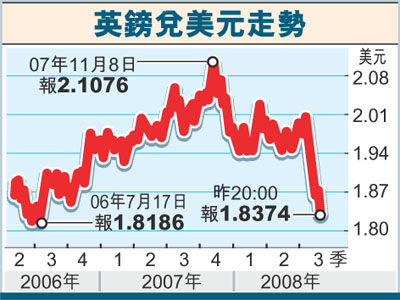 【本報訊】英國8月房價創18年最大跌幅約10.5%,加上通脹為逾10年最高,經濟停滯導致樓市陷入近20年來大衰退,拖累英鎊匯價表現持續不濟。英鎊兌美元跌至近2年低點,於歐洲交易時段早段徘徊1.835水平,月內累計貶值7.5%。英鎊兌歐元更一度跌至4個月來低位,倫敦時間上午7時10分,英鎊兌歐元低見0.8061為4月17日來最低,對上一個交易日尾盤報0.8023。