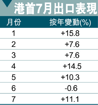 【本報訊】(記者 李永青)繼6月份出口值下跌0.6%後,今年7月份香港出口再度回升11.1%,升幅為今年第三高。但出口界人士指出,出口值回升,只是受原材料價格高企所致,但因海外市場需求疲弱,加上內地生產成本急漲,不少企業擔心微薄的利潤「難抵」高成本,故接單態度保守,故料今年餘下月份出口只能錄得單位數字升幅。