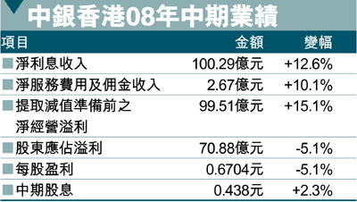 【本報訊】(記者 林淑儀)中銀香港(2388)昨公布今年上半年業績,截至6月30日止,錄得股東應佔溢利下跌5.1%至70.88億元,每股盈利亦降至0.6704元,派發中期息每股0.438元,較去年同期上升2.3%。期內,該行對持有的美國按揭抵押證券組合錄得21.49億元淨減值準備,其中包括4.2億元美國次級按揭抵押證券淨撥回、6.55億元的Alt-A淨撥備,以及19.14億元的Prime住宅按揭抵押證券淨撥備。