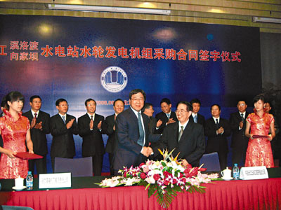 ■中國三峽總公司副總工程師劉利人(右)與哈爾濱電機廠有限責任公司董事長兼總經理吳偉章(左)分別代表兩家公司簽約。