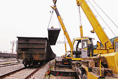 日照港鐵路物流中心在大力發展煤炭、礦砂等主要貨種的同時,不斷調整貨種結構,開發新貨種。首批30噸鋼坯近日成功裝卸吊運(見圖)。本次鋼坯業務月度計劃為3萬噸,隨著鋼坯周轉量的加大,鋼坯將逐漸成為物流中心貨源中的一個穩定貨種。 ■本報駐山東實習記者 譚新道、通訊員 安佰明