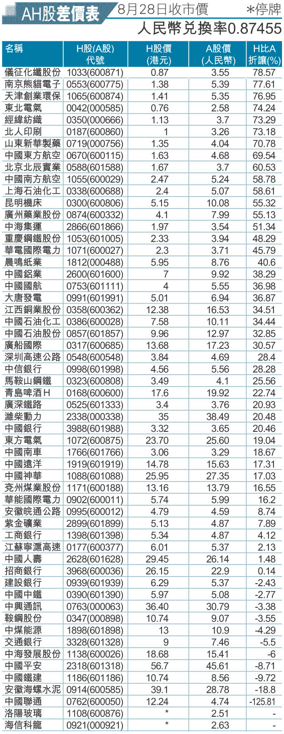 AH股差價表 8月28日收市價 (圖)