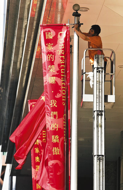 ■尖沙咀海景嘉福酒店員工昨午在酒店外懸掛歡迎冠軍健兒的旗幟。本報記者劉國權 攝