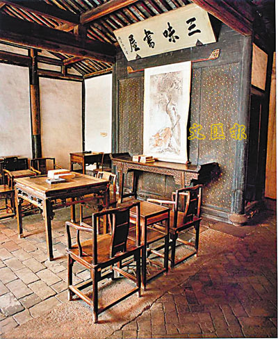 謁過魯翁故居後,看其他的故居就多了幾分心理準備。漸漸諳熟的是故居的架構程式。一般的深巷小院,青牆黑瓦,一般的小巧別致,滿庭生芳。老式的傢具,壁上的照片,陳年的書籍,甚至還有大師們坐立的姿態,都是那麼地相近、相似。漸漸諳熟的也是故居的精氣神魄。聽不見的是講解員的聲音,看得見的是大師們聚攏一起的神采。端坐桌前,奮筆疾書,滿腔的才情頓時化作了傾飛的思想,那持久的穿透力,積在泛黃的紙頁上,至今不變,稍稍吸下氣,就可以聞到。