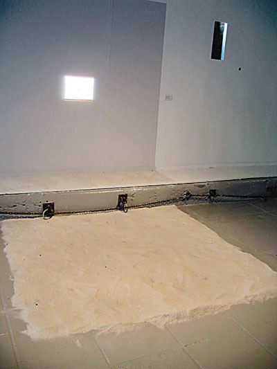 但令記者印象最為深刻的是袁卓華的《The Act of…》,投影熒幕上有一行小字,觀眾和熒幕間卻橫亙一塊沙地,吸引你踩上這藝術品去仔細辨認熒幕上的字句。但聽黃潔宜說來,這作品最重要的卻是聲音。「袁卓華對聲音很敏感,他的作品很微妙,很有詩意。這次的作品是要製造一個空間,心境平和的觀眾才能得其妙處。在熒幕旁有一個很小的擴音器,只有慢慢走到它跟前,很貼近、安靜的時候才能聽到聲音,完全包容在作品中。地上的沙中混合著鹽,在燈光照耀下鹽慢慢溶化,時間的流動同樣微妙。」在這個電子媒介氾濫的年代,書本的浪漫豈非正如這作品所體現出的微妙感覺?手指劃過書頁的質感和聲音,閱讀中時間的凝止與流動……有心之人得此妙處。