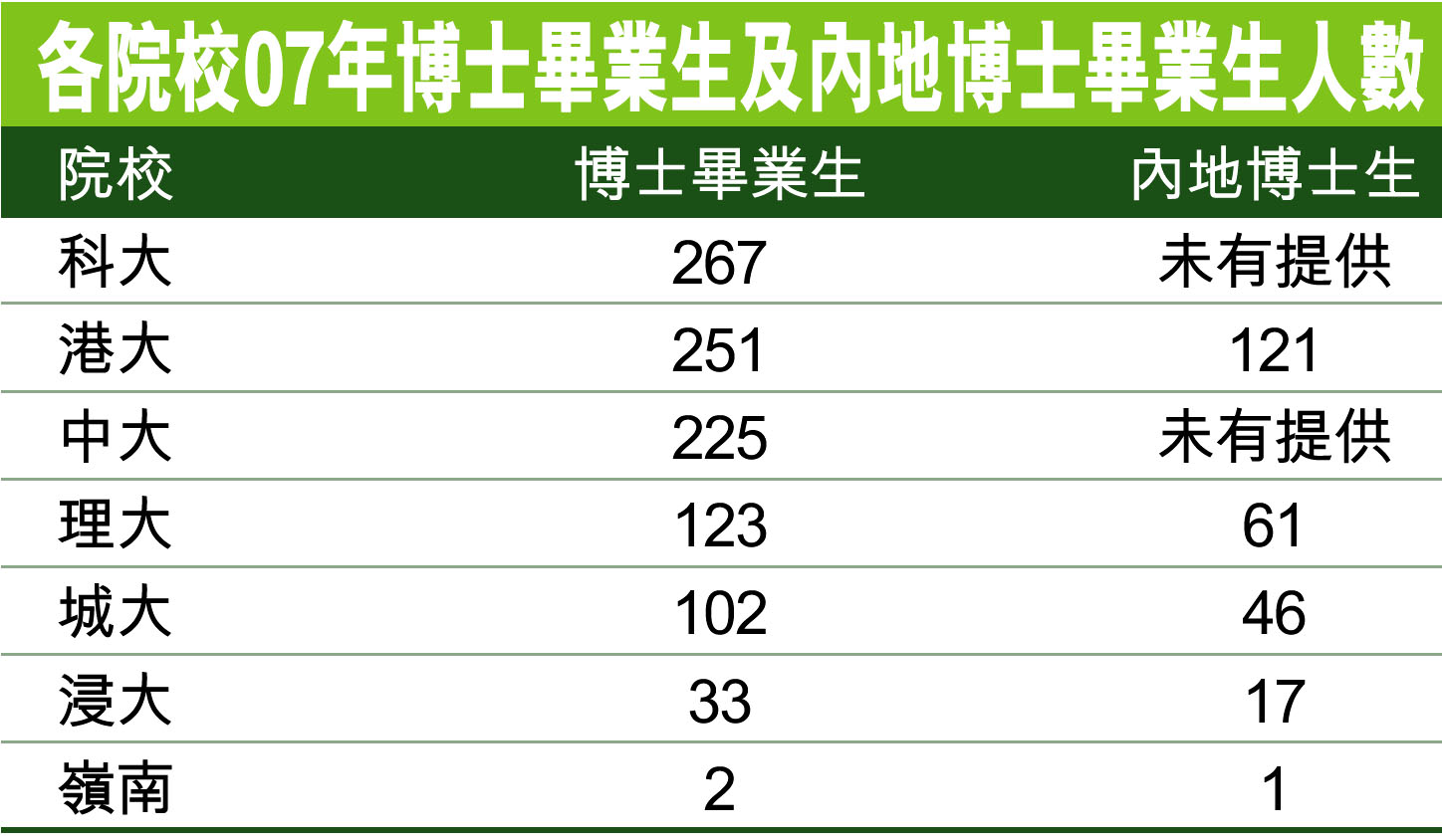 各院校07年博士畢業生及內地博士畢業生人數 (圖)
