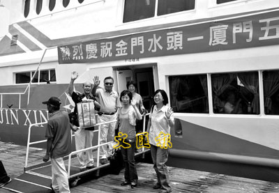 ■金門水頭往返廈門五通碼頭新航線31日開通,為金門小三通第二條航線,旅客在水頭碼頭興奮搭乘往五通的首班船「金星輪」上「陸」。 中央社