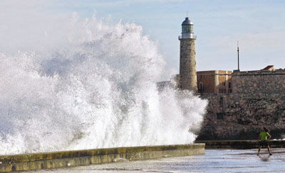 ■「古斯塔夫」襲擊古巴海岸時,掀起巨浪。 法新社