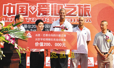 9月1日上午,參加「08中國愛心之旅」的NBA火箭隊球星巴蒂爾,來到四川地震極重災區都江堰市勤儉人家災民安置點慰問災區民眾。圖為巴蒂爾與匹克公司為四川災區孩子捐贈價值二十萬元人民幣的體育器材,以幫助青少年健康成長。 中新社