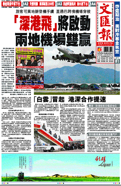 接近深圳機場的消息人士透露,港深機場的客運合作「深港飛」項目,將於本月啟動,以實現港深機場的資源互補。在日前國際機場協會(ACI)公佈的2007年全球機場報告中,香港機場貨運量排名第2,而深圳機場的全球排名也有所上升,客、貨運排名分別為第63、33位。業內人士預計,兩地機場的進一步合作,不僅使香港機場和深圳機場的客、貨運受益,還將提升兩機場在區域內的整體競爭力,即使面對日本成田、韓國仁川、新加坡樟宜等有意成為國際性航空樞紐的機場的競爭,也不會遜色。