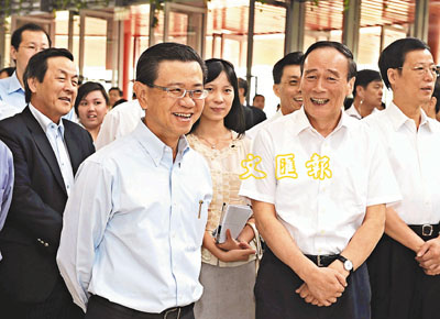 ■有關消息指出,國務院副總理王岐山(右二)年底前將負責組建全新的外資併購聯席委員會。圖為王岐山視察中新天津生態城起步區。 新華社
