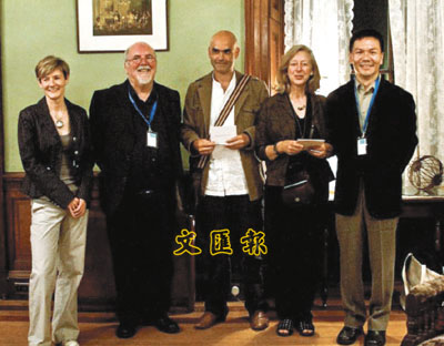【本報訊】香港土產詩人梁世聰(右一)於今年的Edwin Morgan國際詩詞創作比賽中,憑英文詩《What the Pig Mama Says》贏得季軍,證明港人在英語寫作方面也可在國際文學界獲得認同。 梁世聰提供