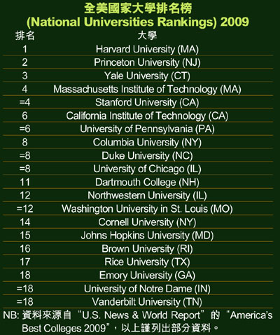 正當同學們在收拾心情準備開學,美國的著名雜誌—《美國新聞與世界報道》( “U.S. News & World Report”) 亦於8月22日發佈了最新全美最佳大學排名榜“America's Best Colleges 2009”。 將全美國提供學位的大學分成幾類,當中最受注目的排名榜分別為:國家大學 (National Universities) 、人民通識學院 (Liberal Arts Colleges) 、地區性碩士學位大學 (Master's Universities)、地區性學士學位大學 (Baccalaureate Universities)、不設排名的專科學院 (Unranked Specialty Schools) 和兩個個別科目的大學排名榜,包括最佳商科學士學位課程 (Best Undergraduate Business Programs)和最佳工程學學士學位課程 (Best Undergraduate Engineering Programs)等。在國家大學及人民通識學院的排名裡,共分了4層 (4 Tiers)。 而碩士大學及學士學位大學排名裡,則把美國的大學細分了四個區域來作排名,分別為 North、South、Midwest 及West等。這種細分的排名榜可以讓學生及家長能更容易比較美國各大學,以便作出最適合學生需要的選擇。