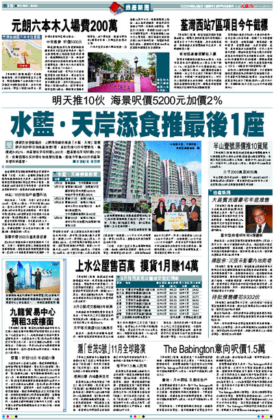 於8月8日奧運開幕日取得售樓紙的「水藍.天岸」,發展商曾擔心奧運期間推盤會影響銷情,但結果是挾奧運氣勢成功搶閘,於8月17日開始推售銷情即見熾熱,令市場刮目相看,且三度創出新界西分層單位新高呎價,其中第1座頂層A連天台單位,面積1,747呎,成交價1,663.1萬元,呎價達9,500元,已打破東涌分層單位新高呎價,至於第2座頂層A示範屋,面樍1,747呎連天台1,168呎,成交價1,880萬元,呎價高見1.08萬元,近日更以呎價1.13萬元售出第2座頂層一個面積1,747平方呎的示範單位,涉資1,979萬元,更創出新界西分層單位新高呎價。