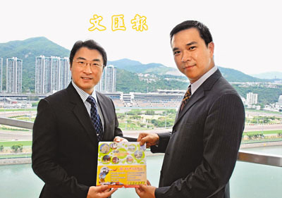 ■中原地產沙田及馬鞍區營業董事麥成輝向剛晉升為沙田區域營業經理蔡創文(左)送上 馬術門票添喜慶。