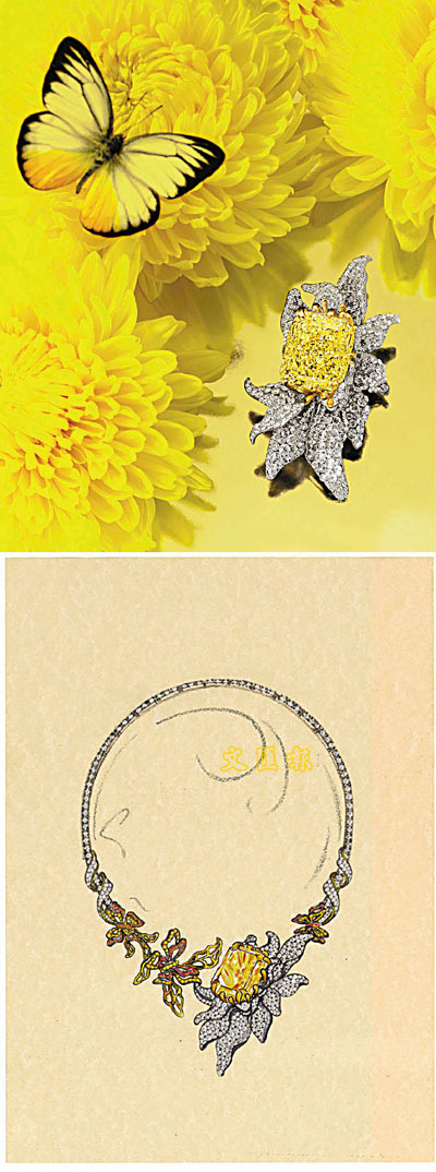 ■(上圖)重達102.56卡拉的鮮彩黃鑽。(下圖)鮮彩黃鑽鑲鑽石項鏈設計草圖。