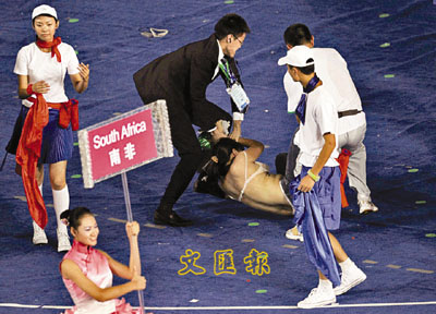 據了解,6日晚上的北京殘奧會開幕式上,在挪威代表團進入場地的時候,有一個女觀眾突然闖入現場,並試圖脫掉上衣,但隨即被現場工作人員控制住並勸離。